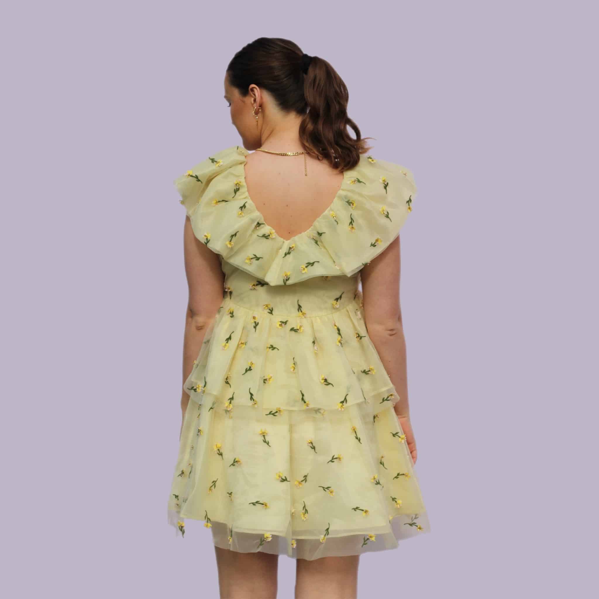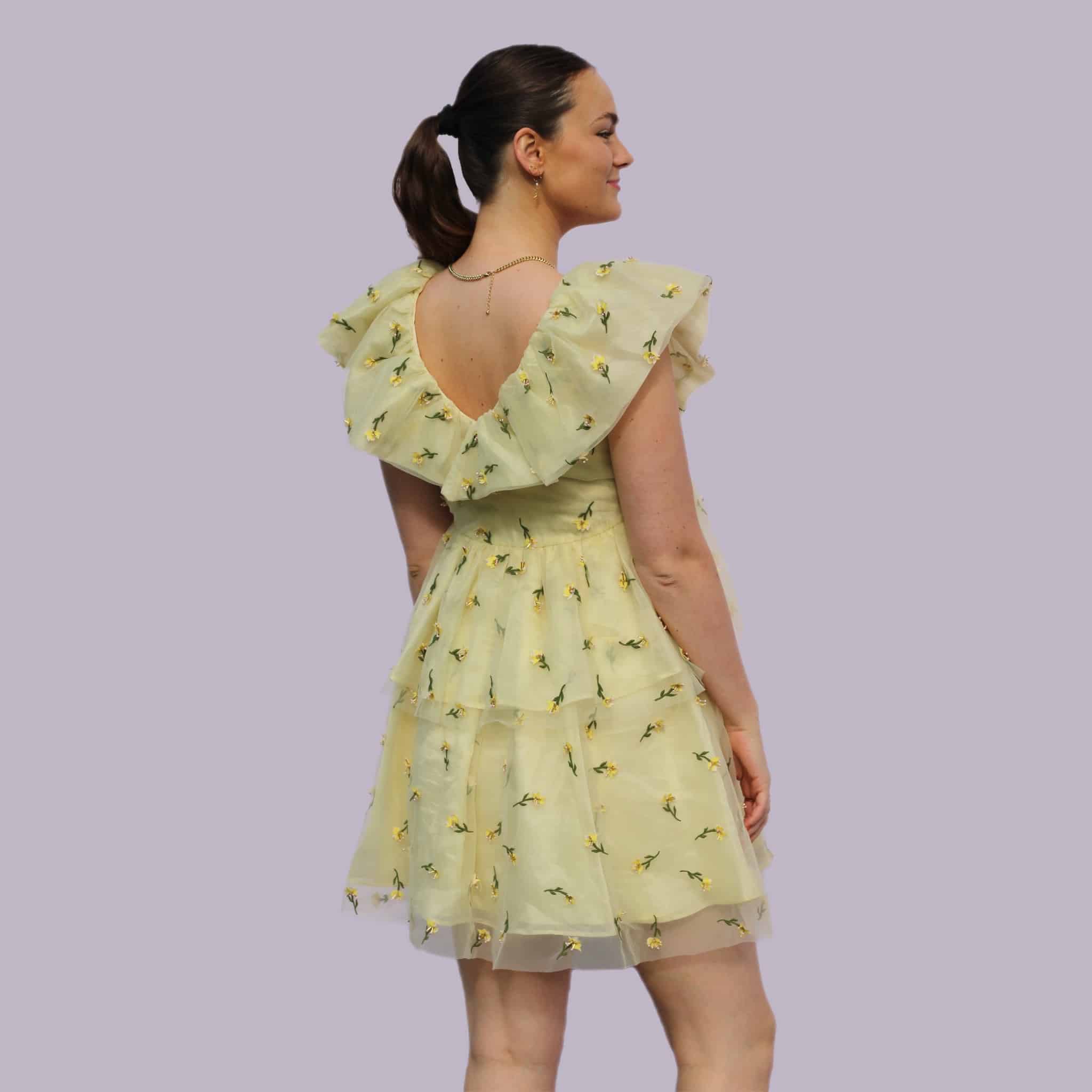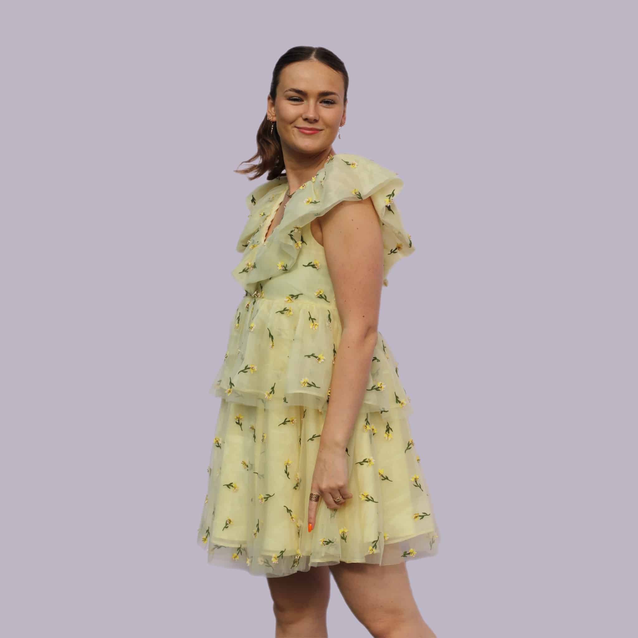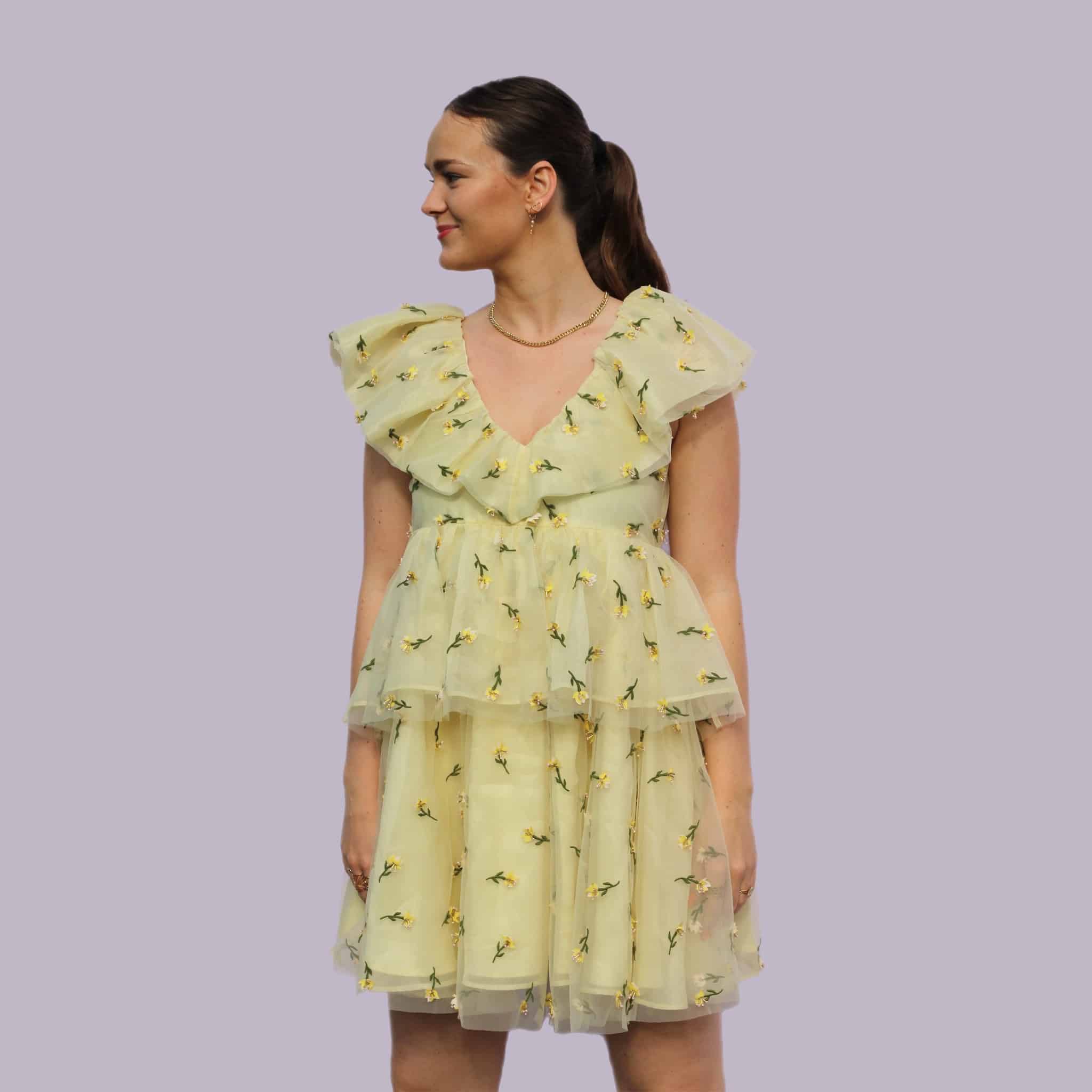 Ganni Bliss er efterhånden blevet en rigtig eftertragtet kjole. Hvilket man forstår. Kjolen har påsyede små bloster på tyllet, med små perler ved hver blomst. En kjole med god volumen og mulighed for mange forskellige outfits.