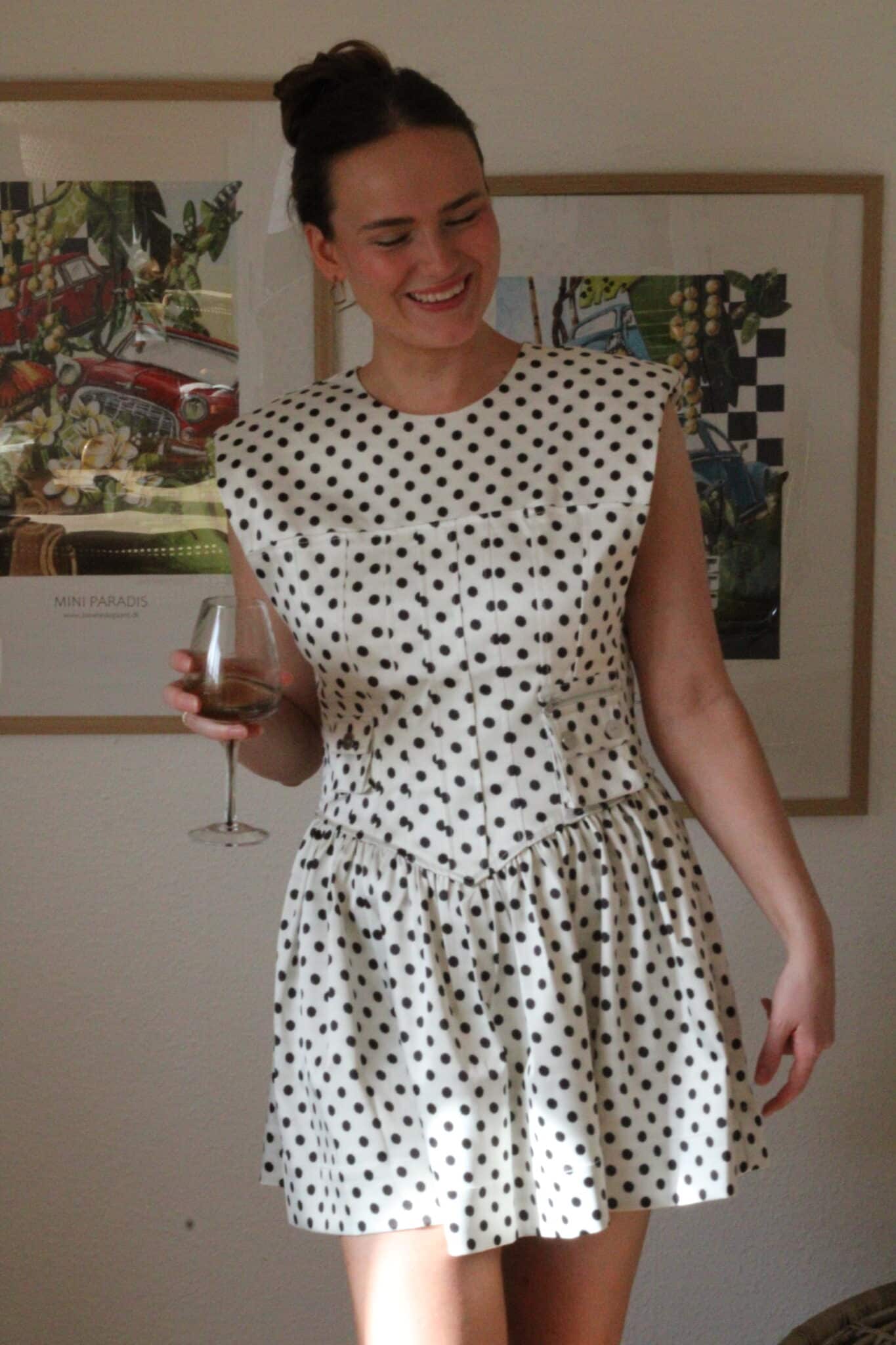 Elegant og figursyet kjole i prikket satin med corset-detaljer.