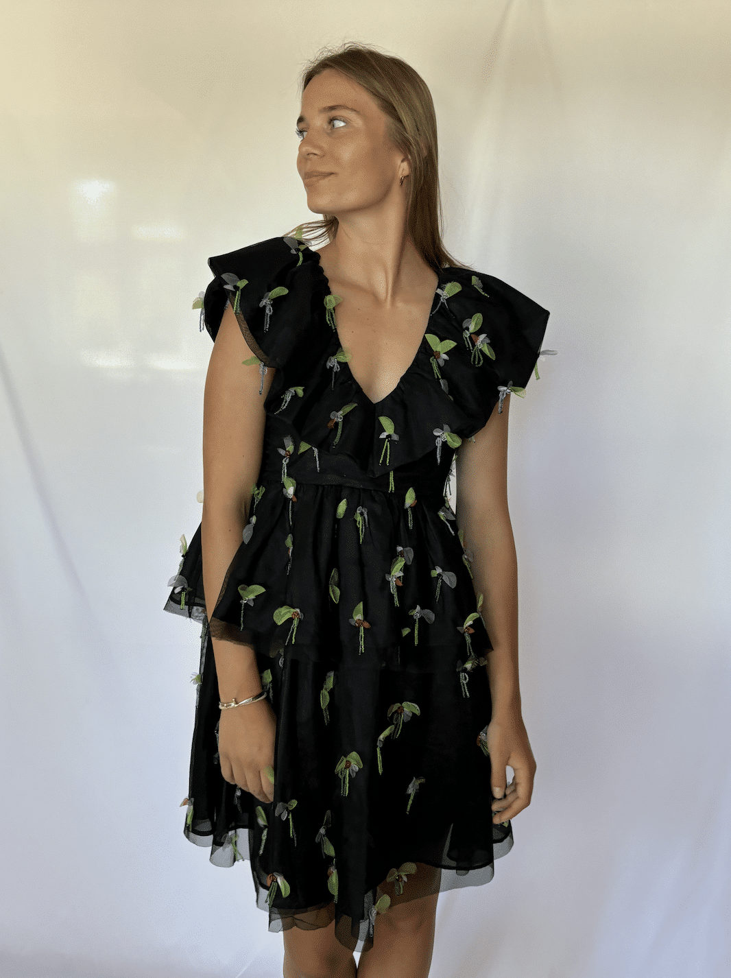 Smuk tyl-kjole fra Ganni med påsyede perler i grønne nuancer.