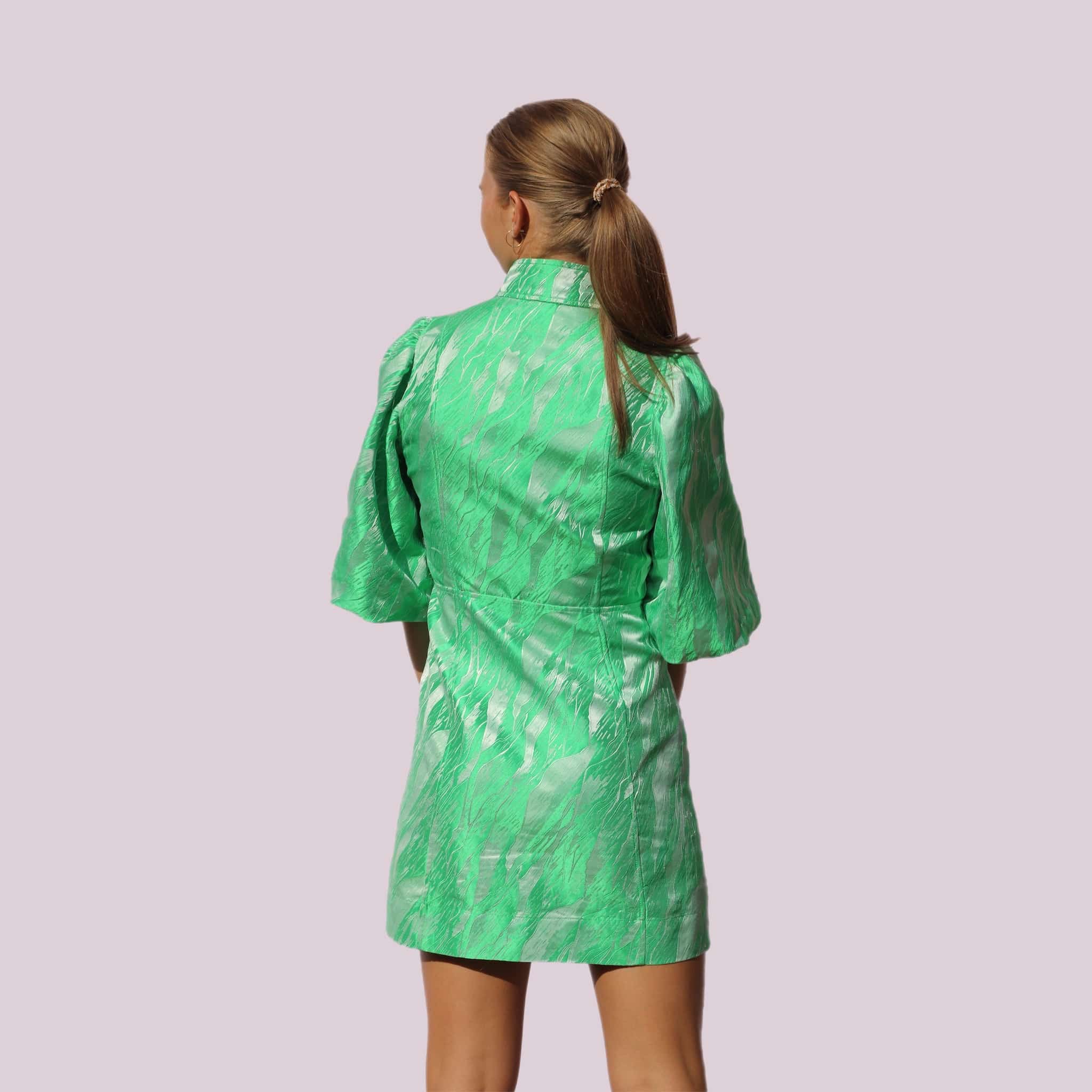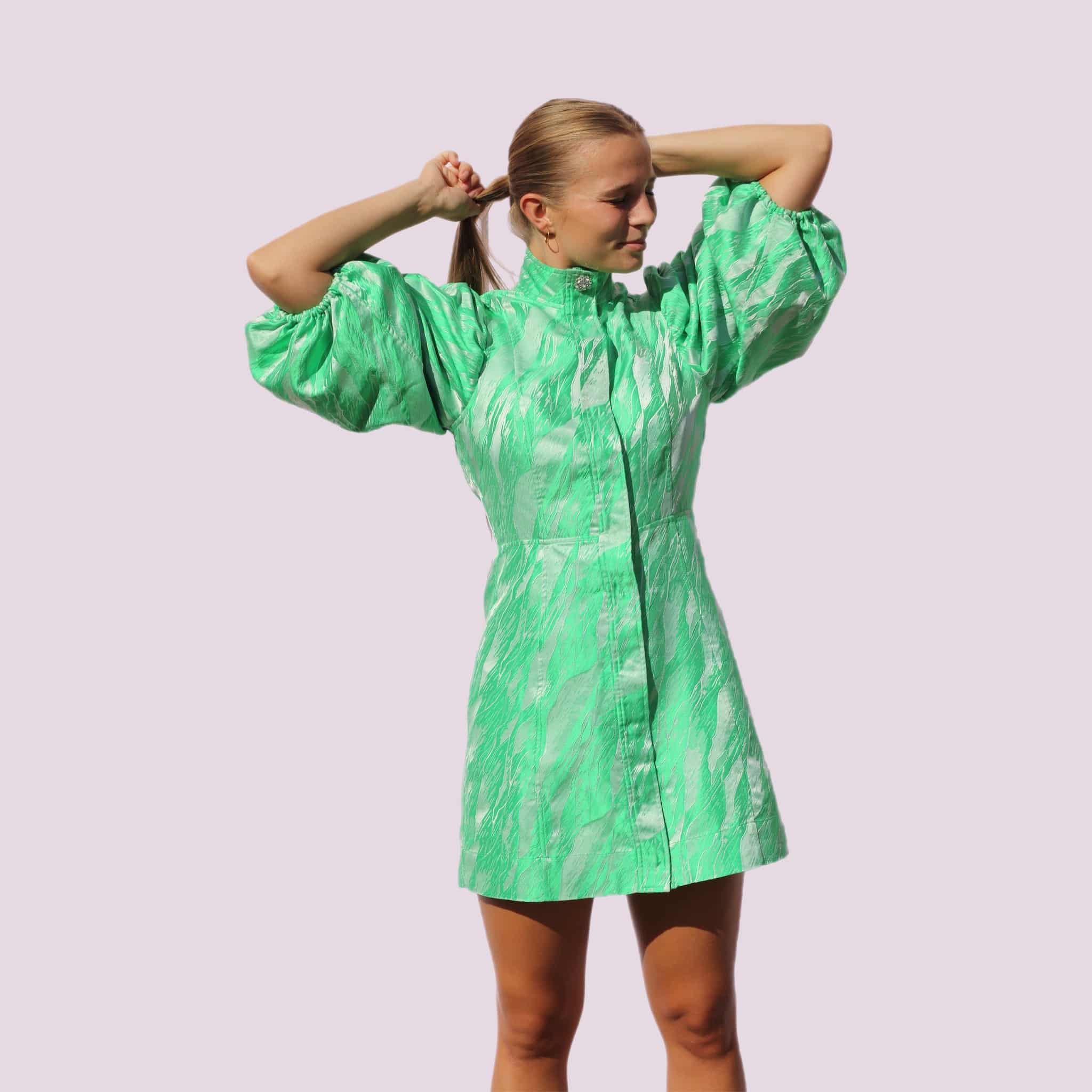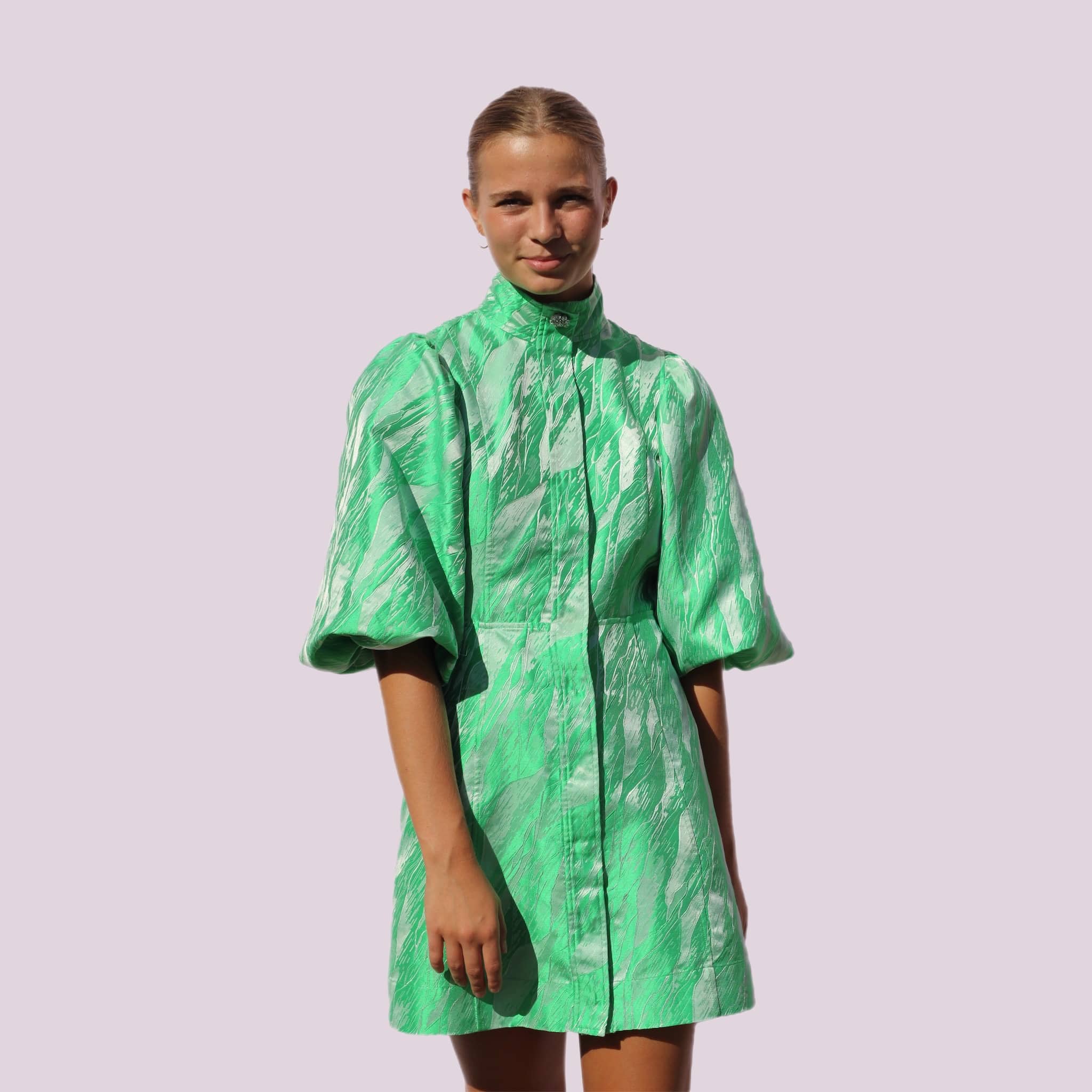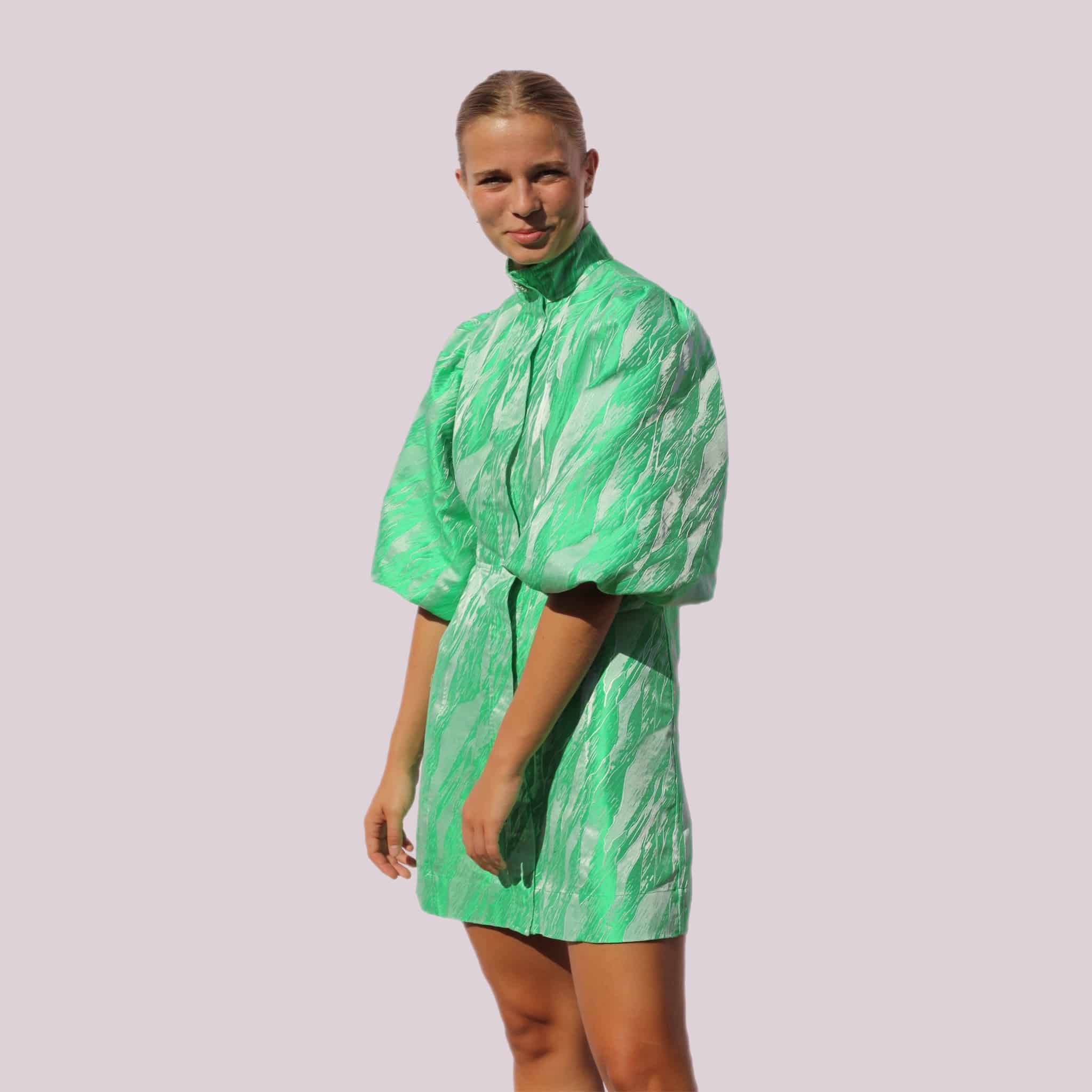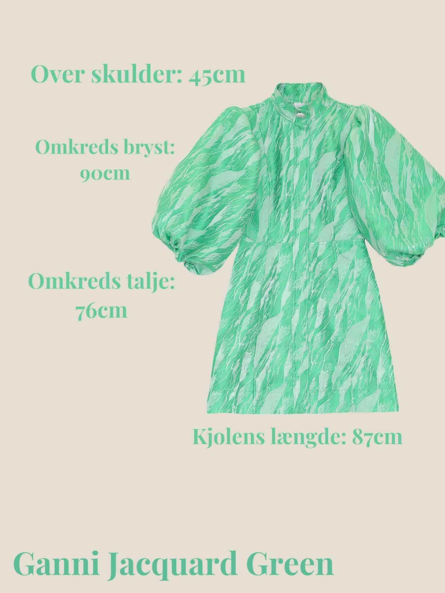 Ganni Jacquard model med knapper hele vejen ned foran. Fin detalje øverst med den store diamant knap.