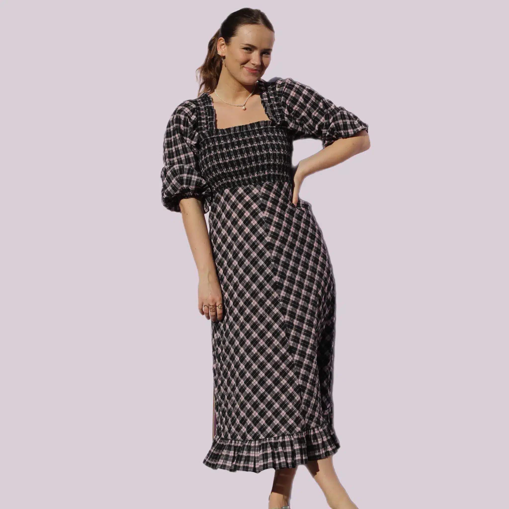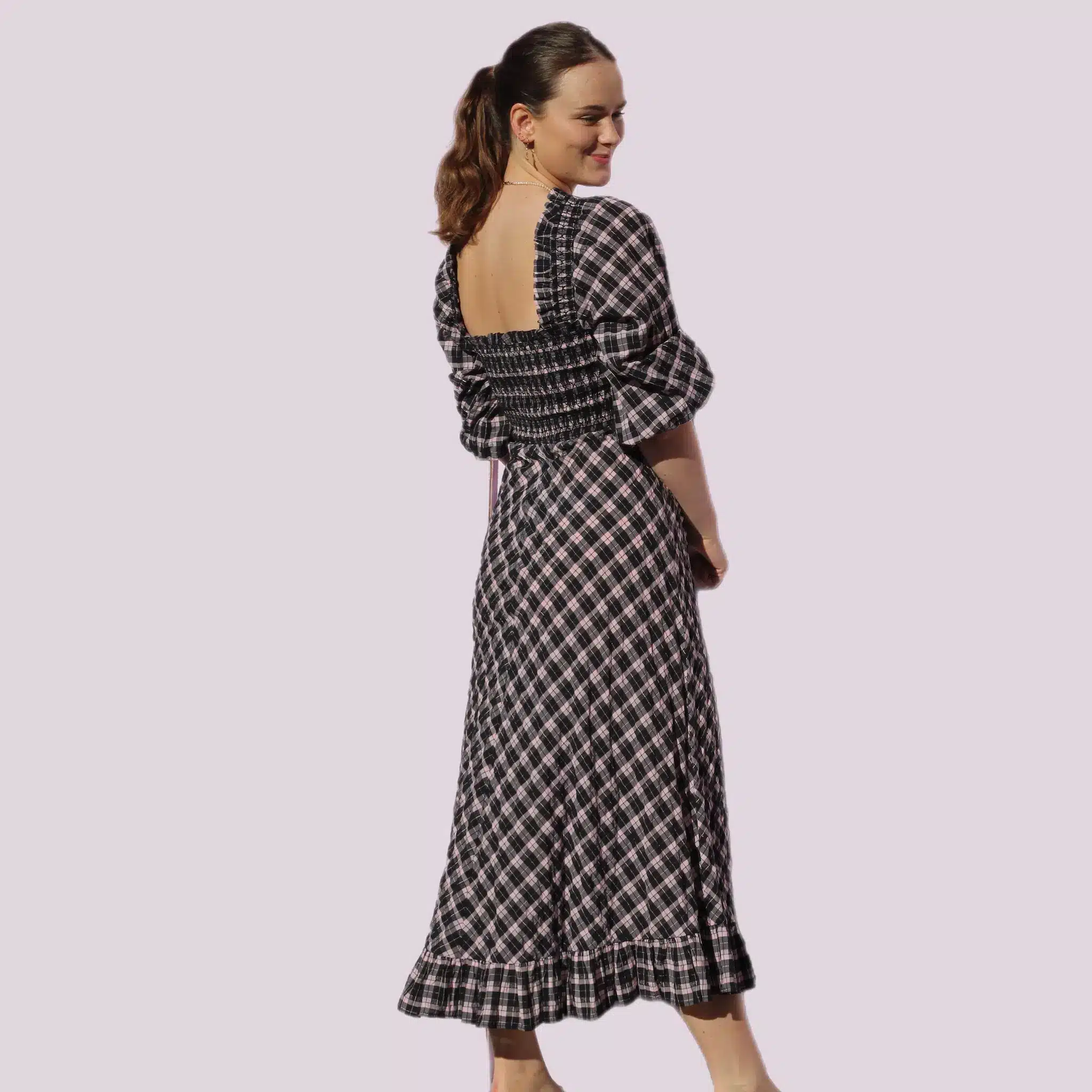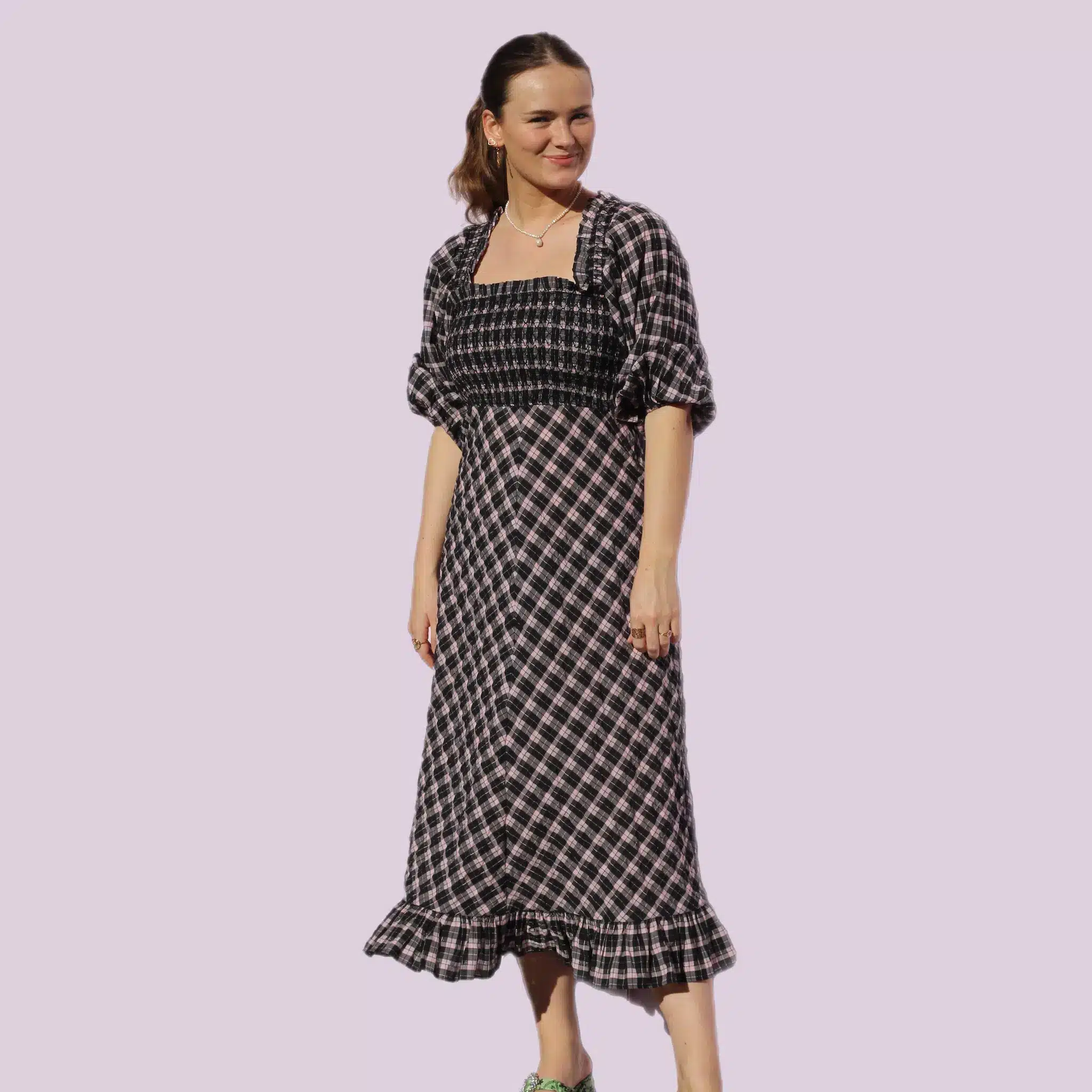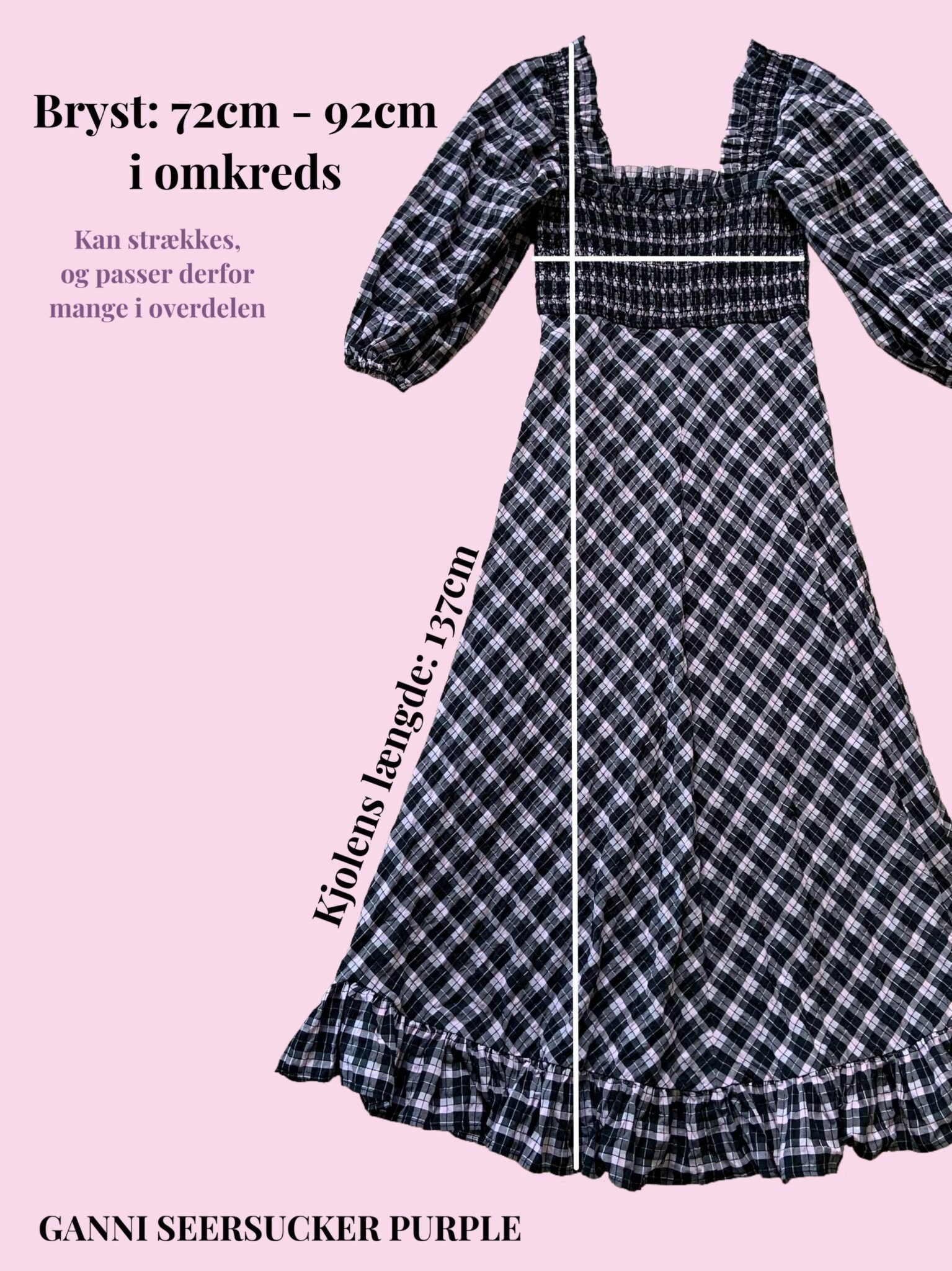 Gannis velkendte seersucker kjole med både smock og pufærmer. Str. S, men passer både S og M.