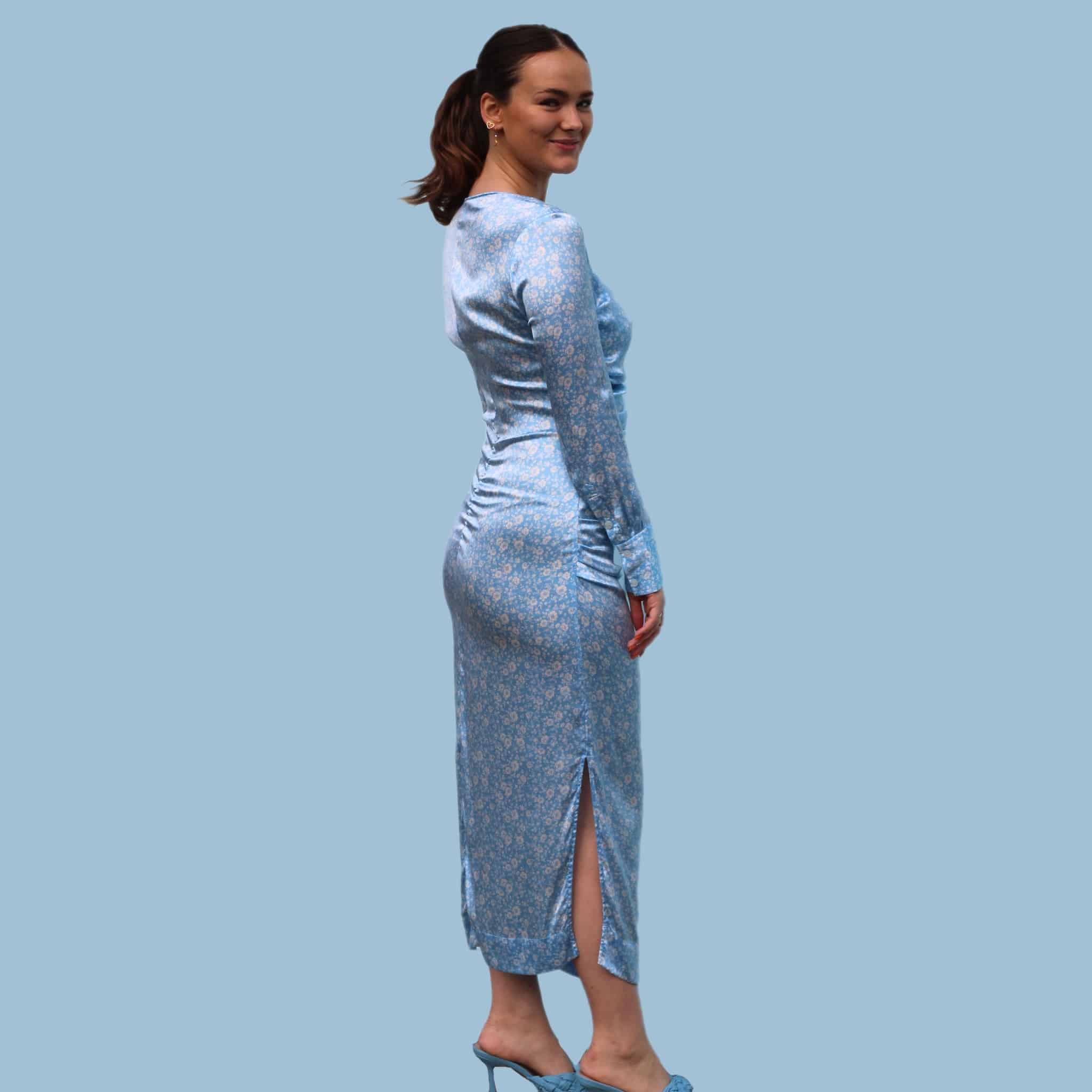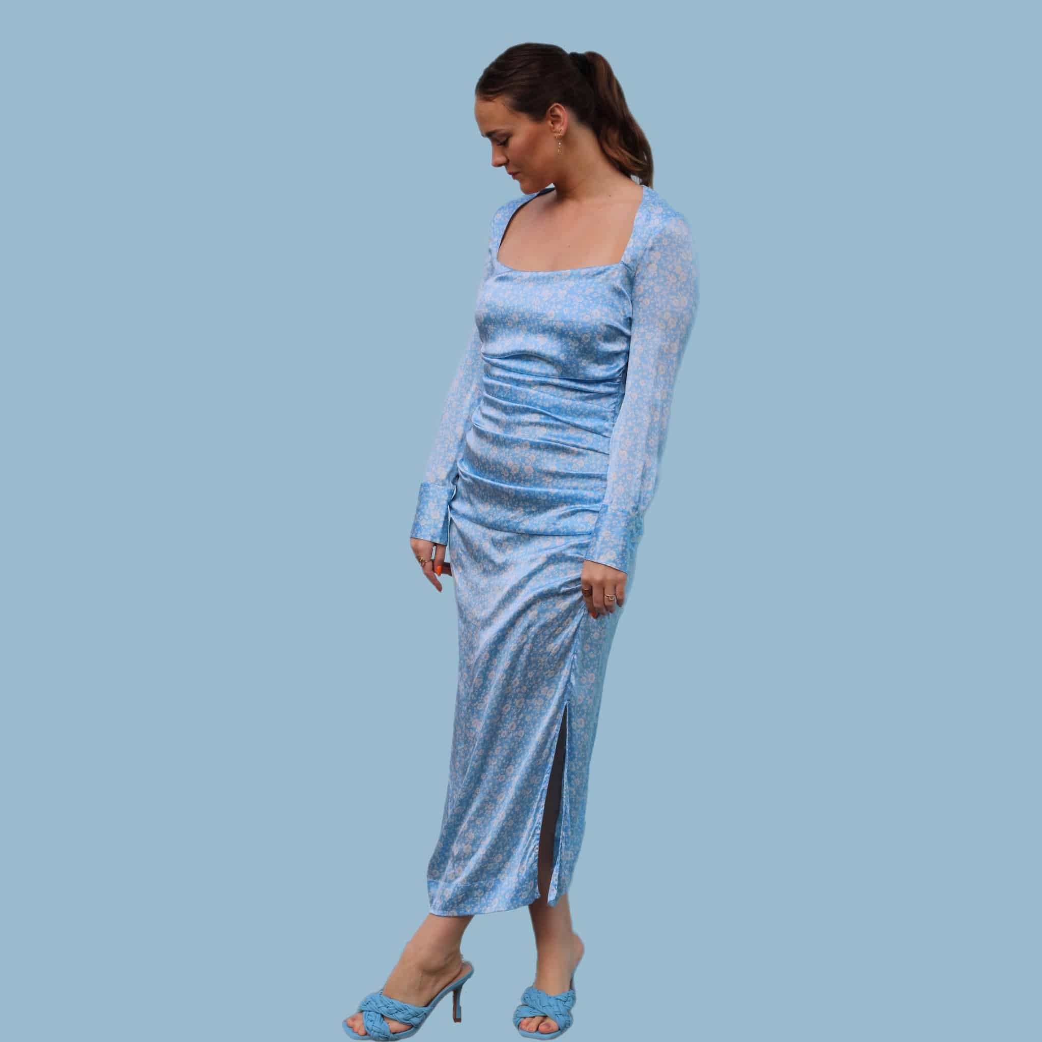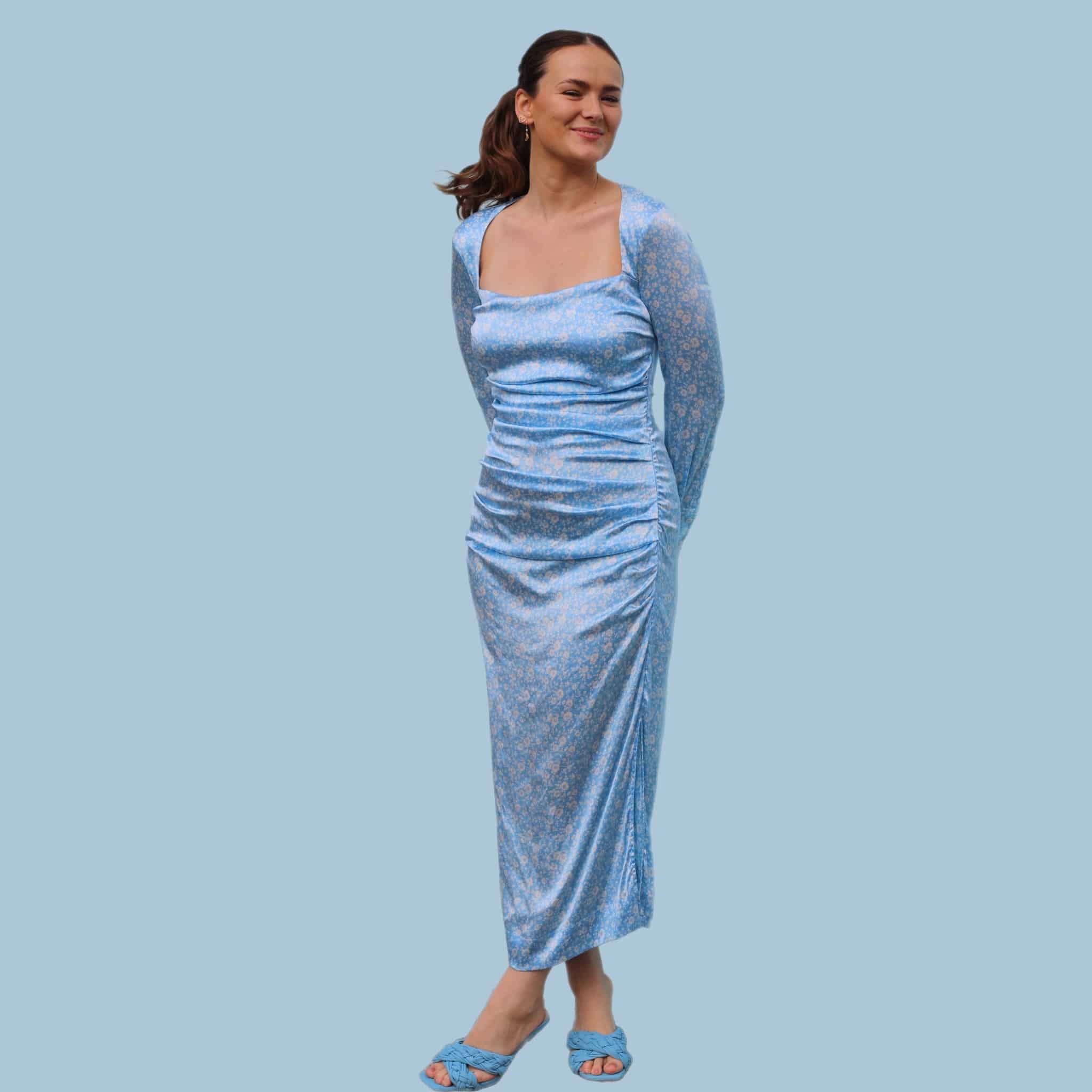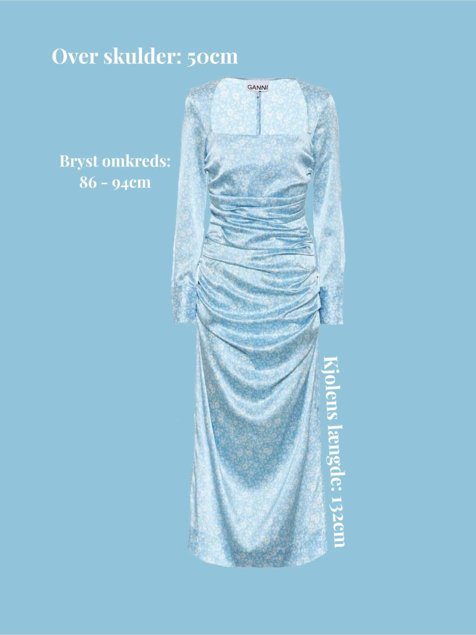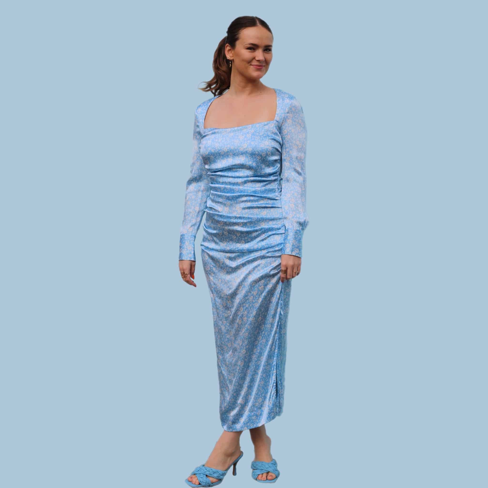 Ganni silke kjole i blå. Med den smukkeste firkantede udskæring. Lille i størrelsen, passer bedst en 36/38.