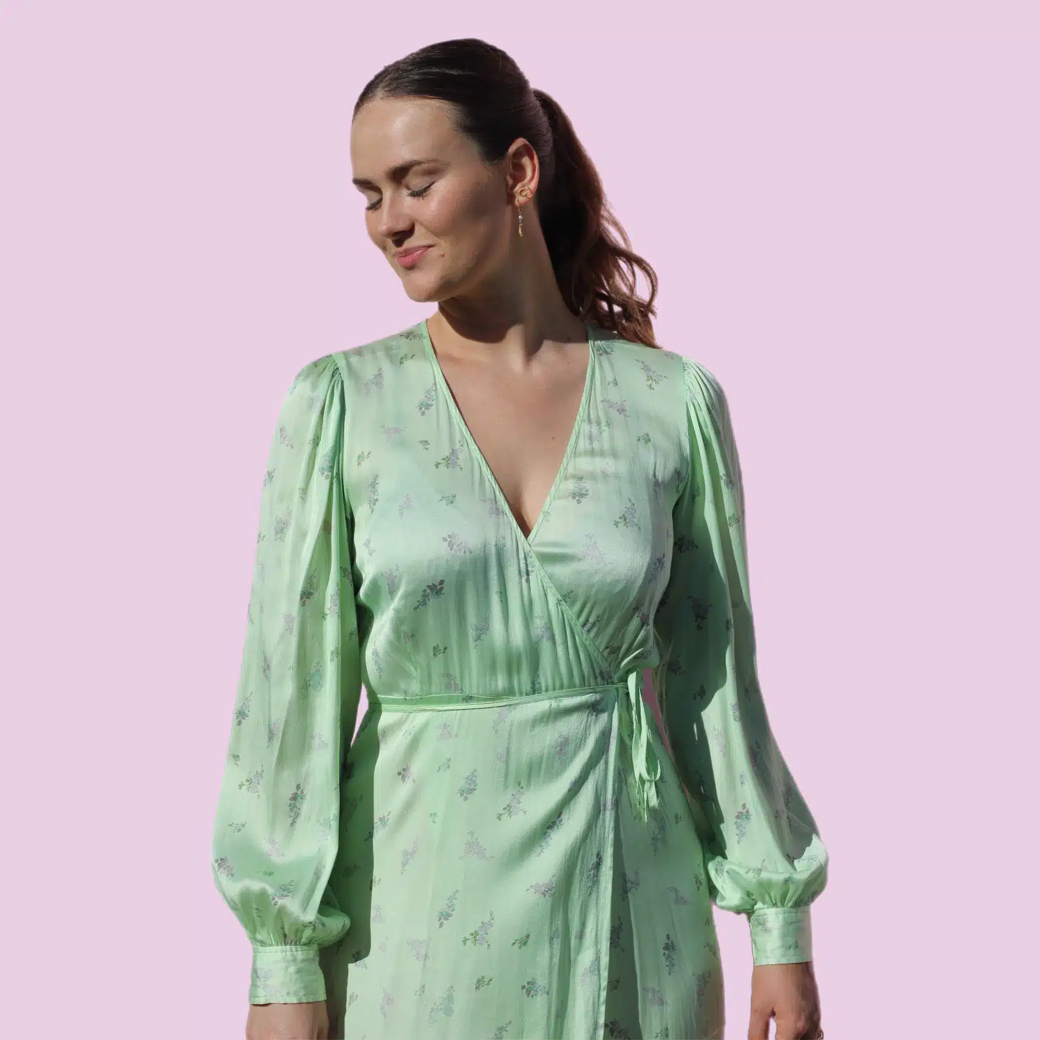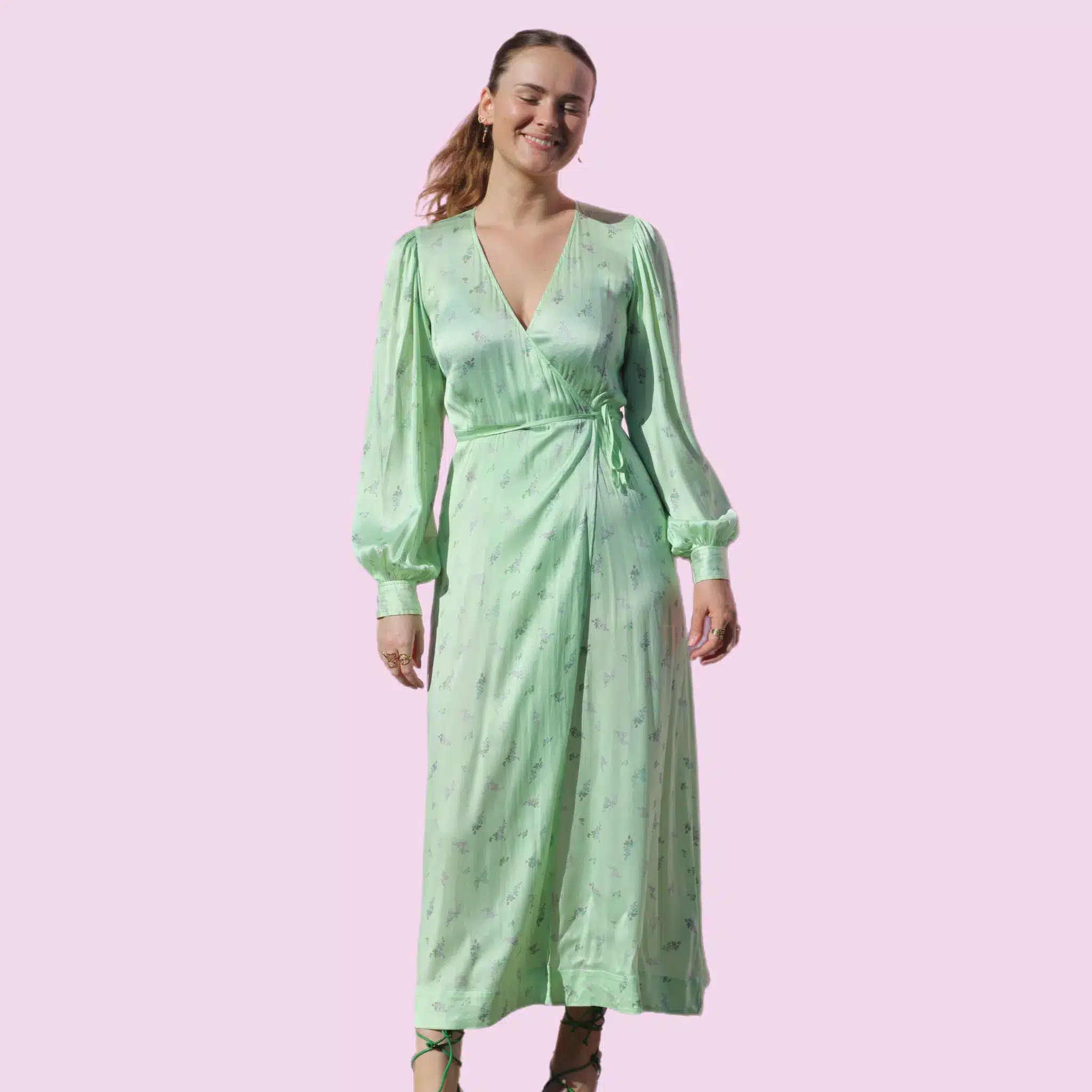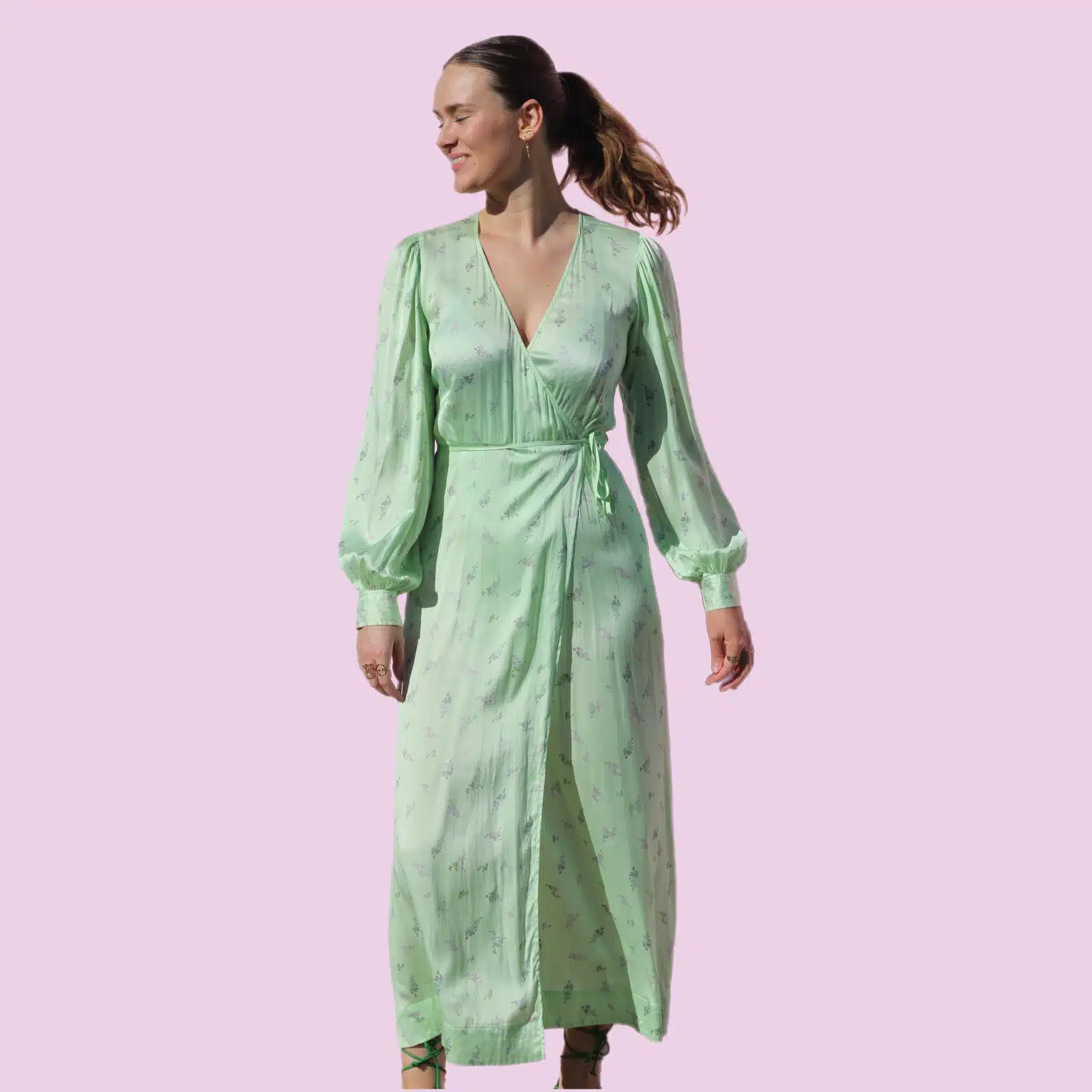 Smuk silke kjole med wrap-effekt.