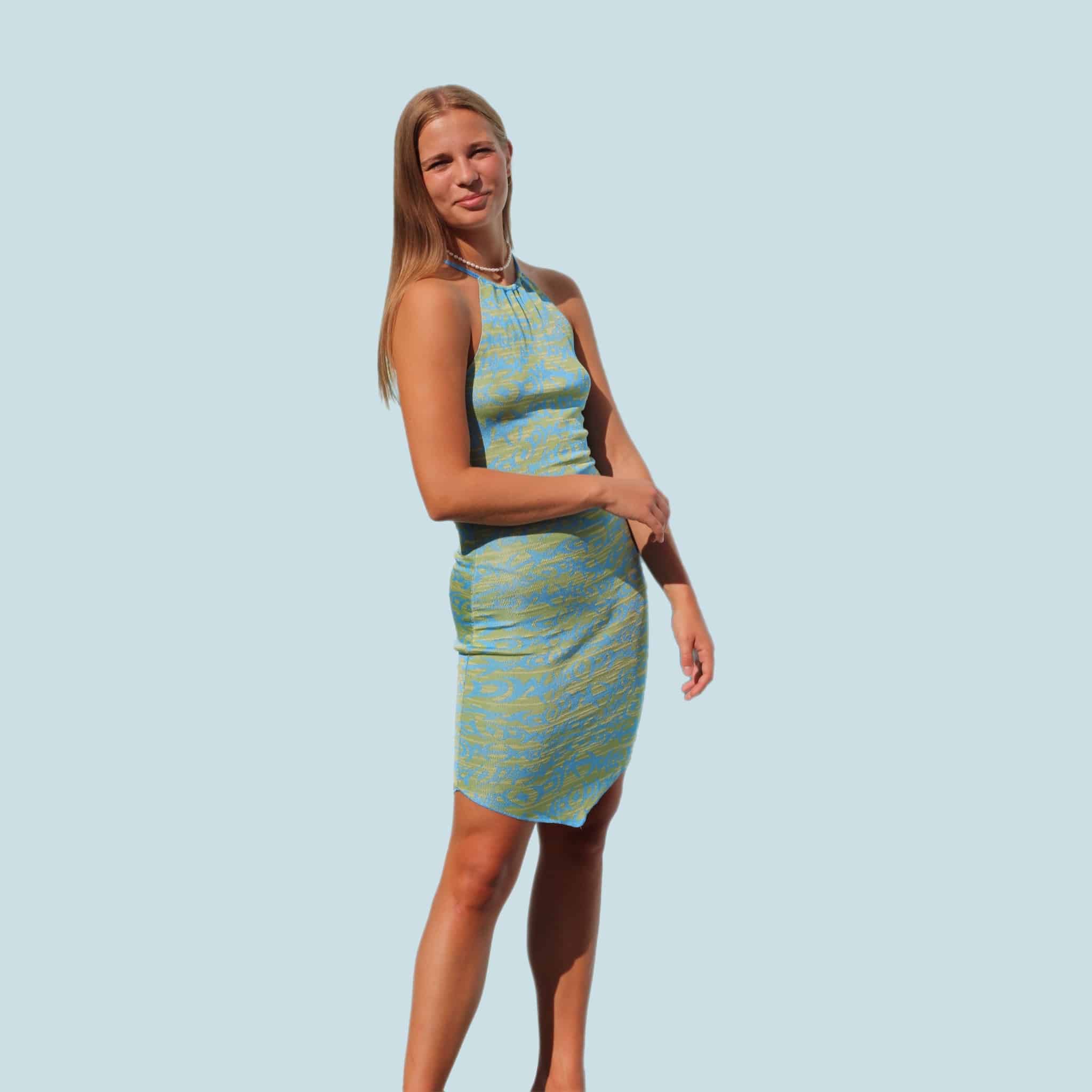 Paloma Wool laver kjoler der skiller sig ud, og denne er ikke en undtagelse. Smukt mønster med friske farver. Bindes i nakken og kan justeres.