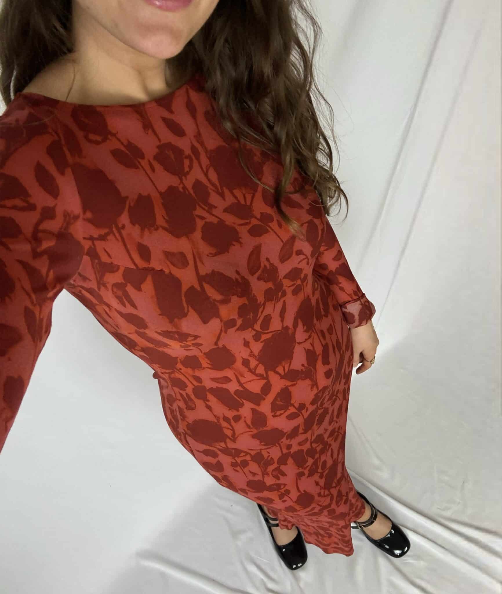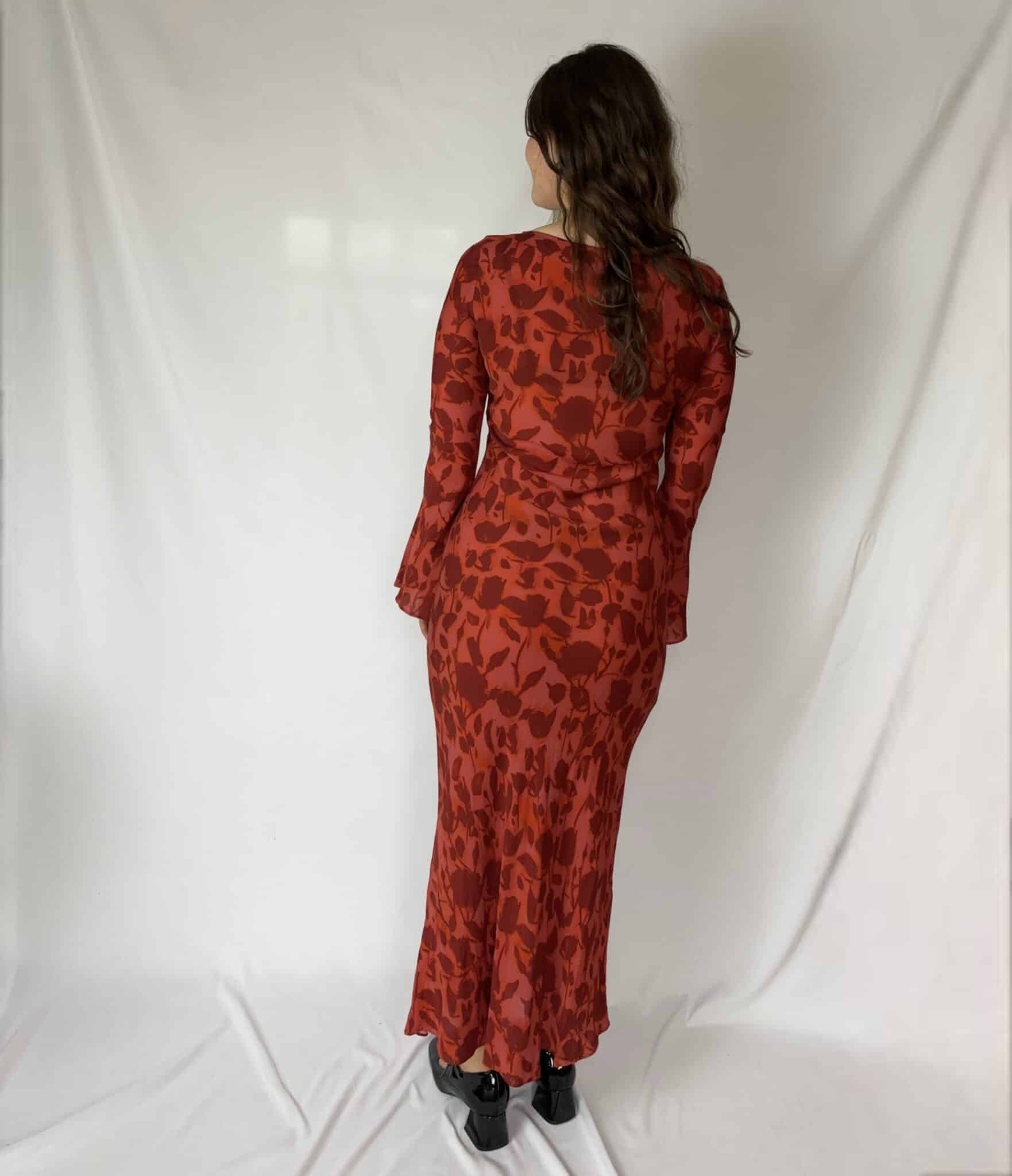 Langærmet kjole i dybrød med blomstermønster og elegant fald.