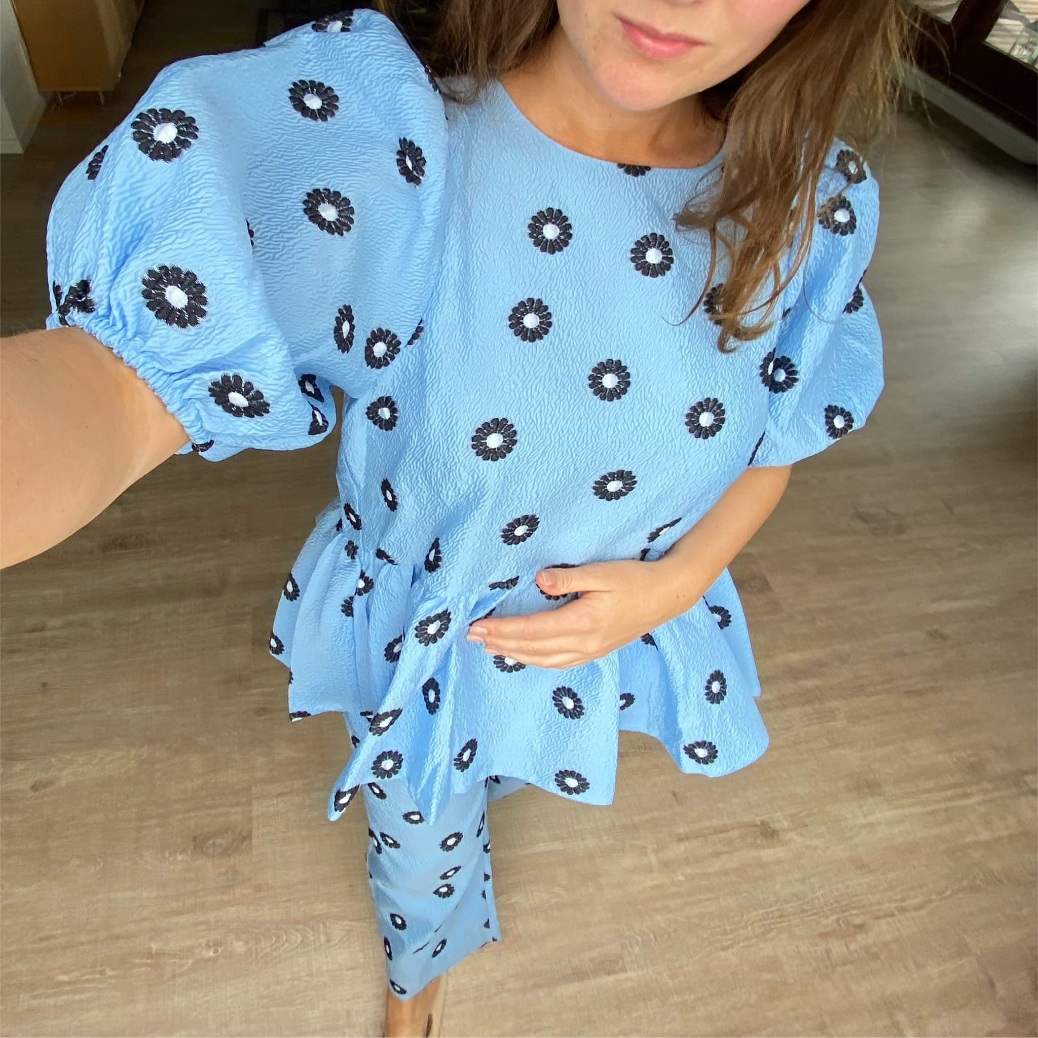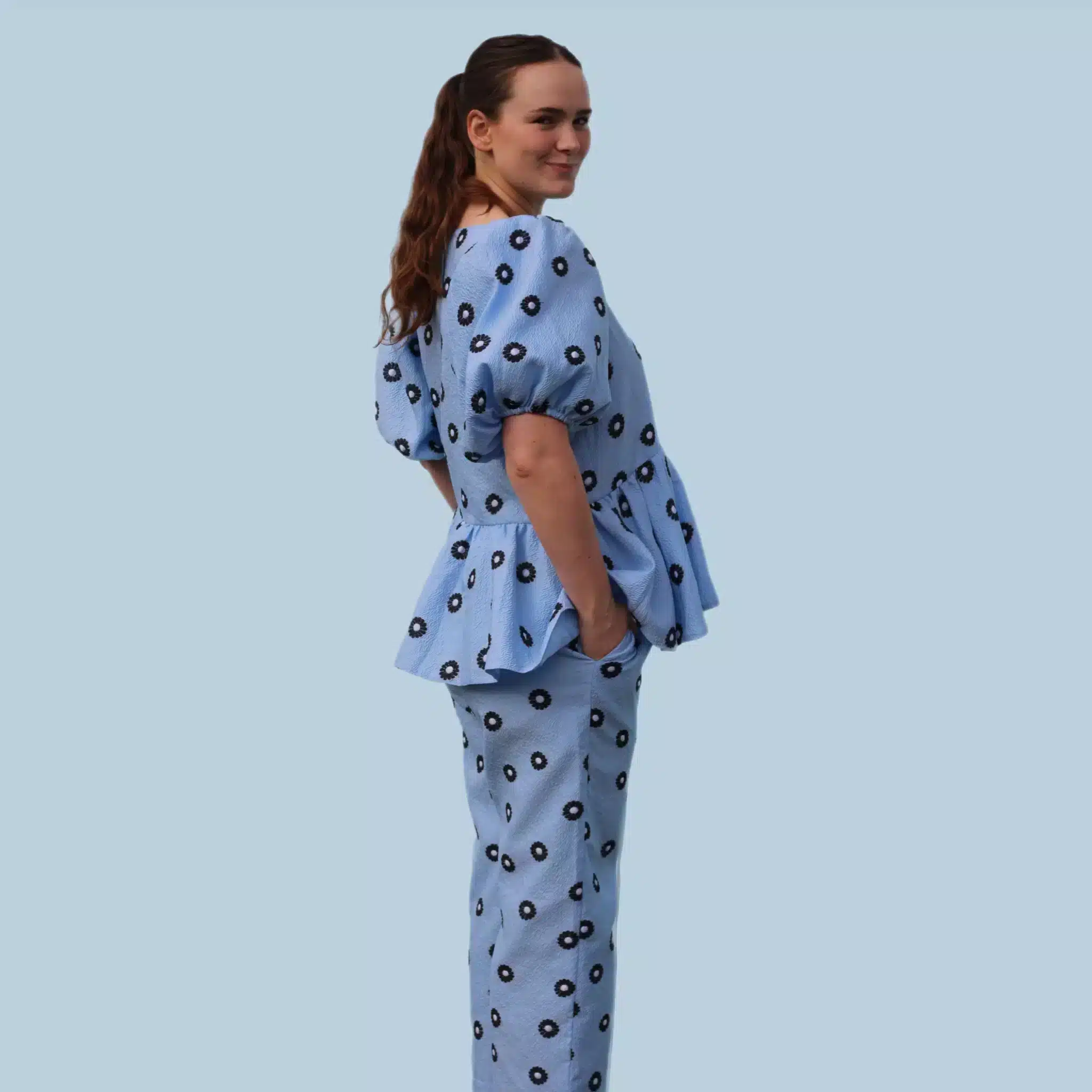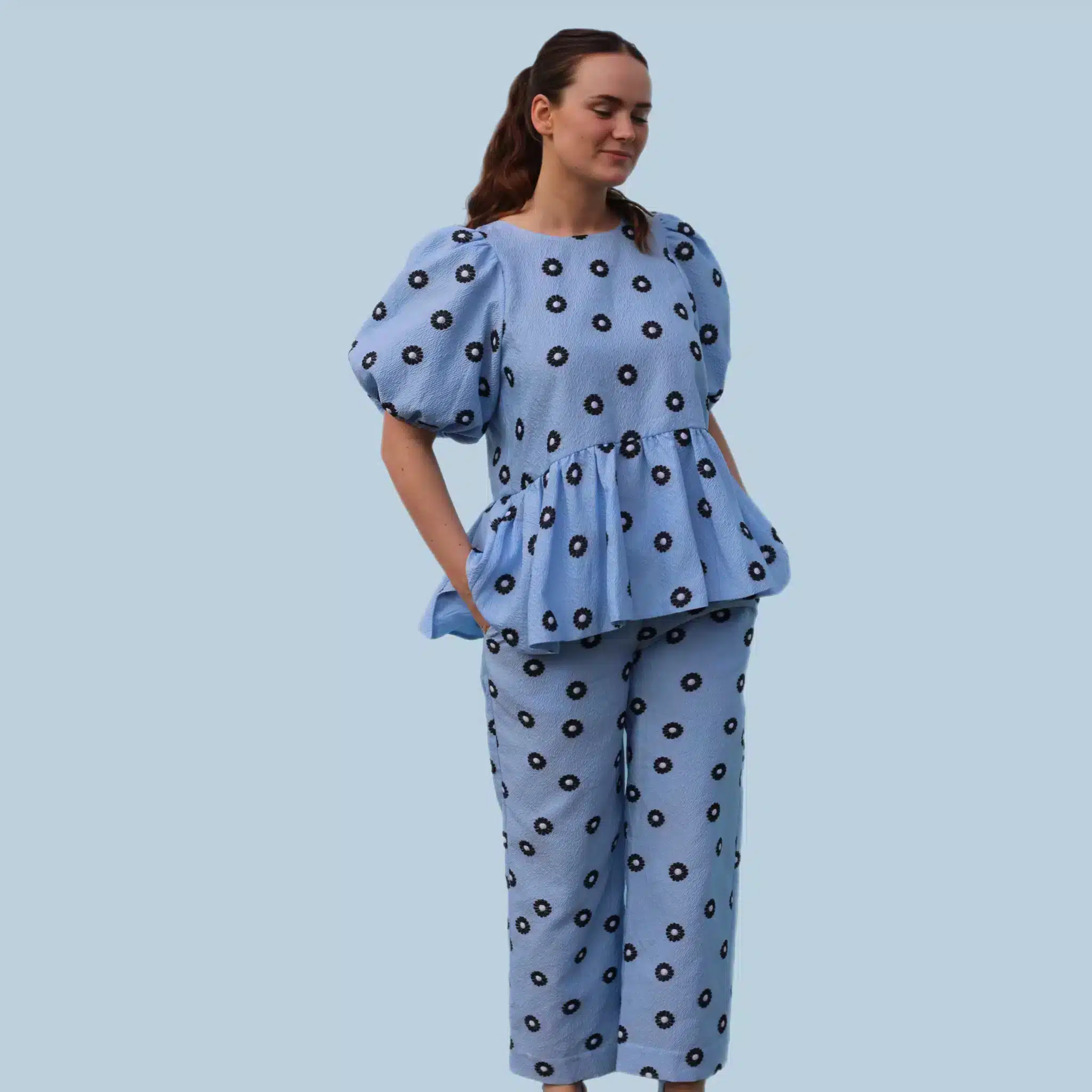 Sæt med blå blomsterprint fra Stine Goya – inkluderer top og nederdel i let og feminin stil.